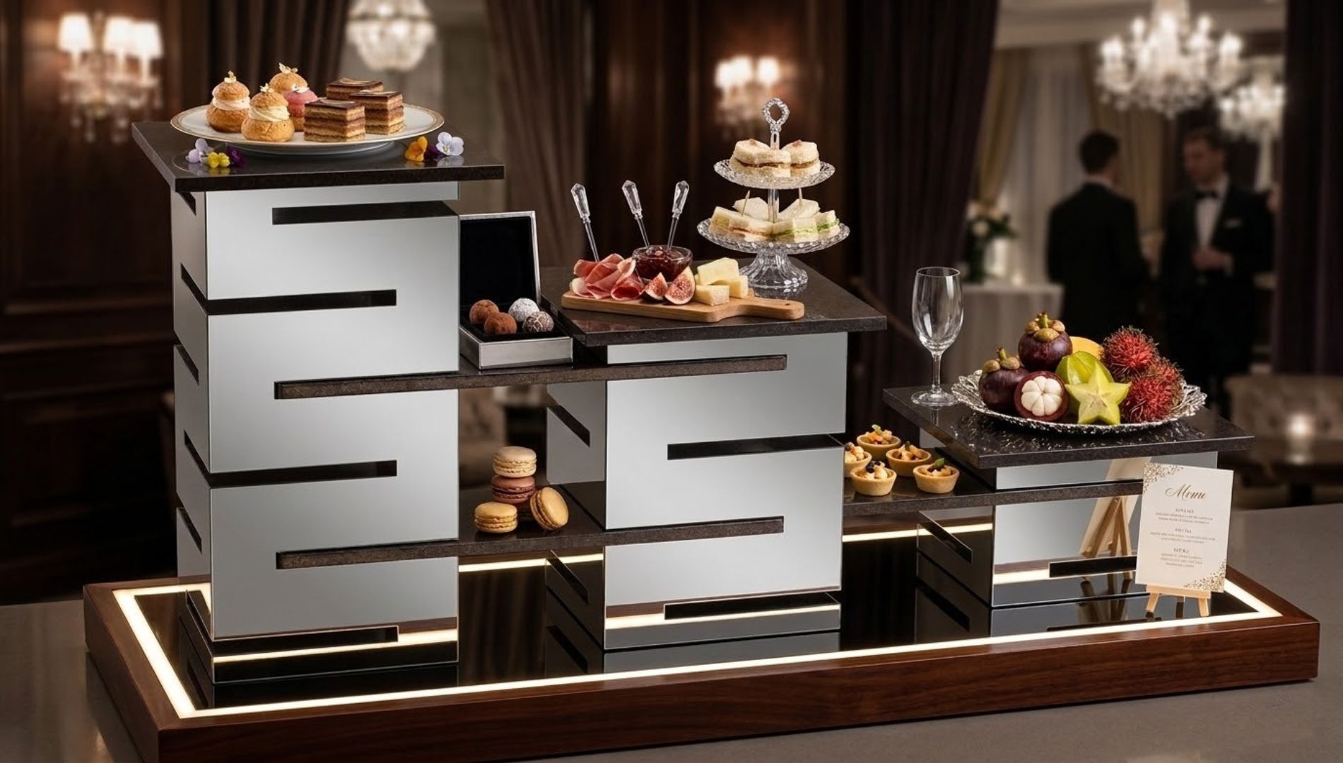 High-quality buffet display stands and food presentation stands are made from durable materials such as stainless steel, wood, glass, and metal, ensuring strength and long-lasting performance.